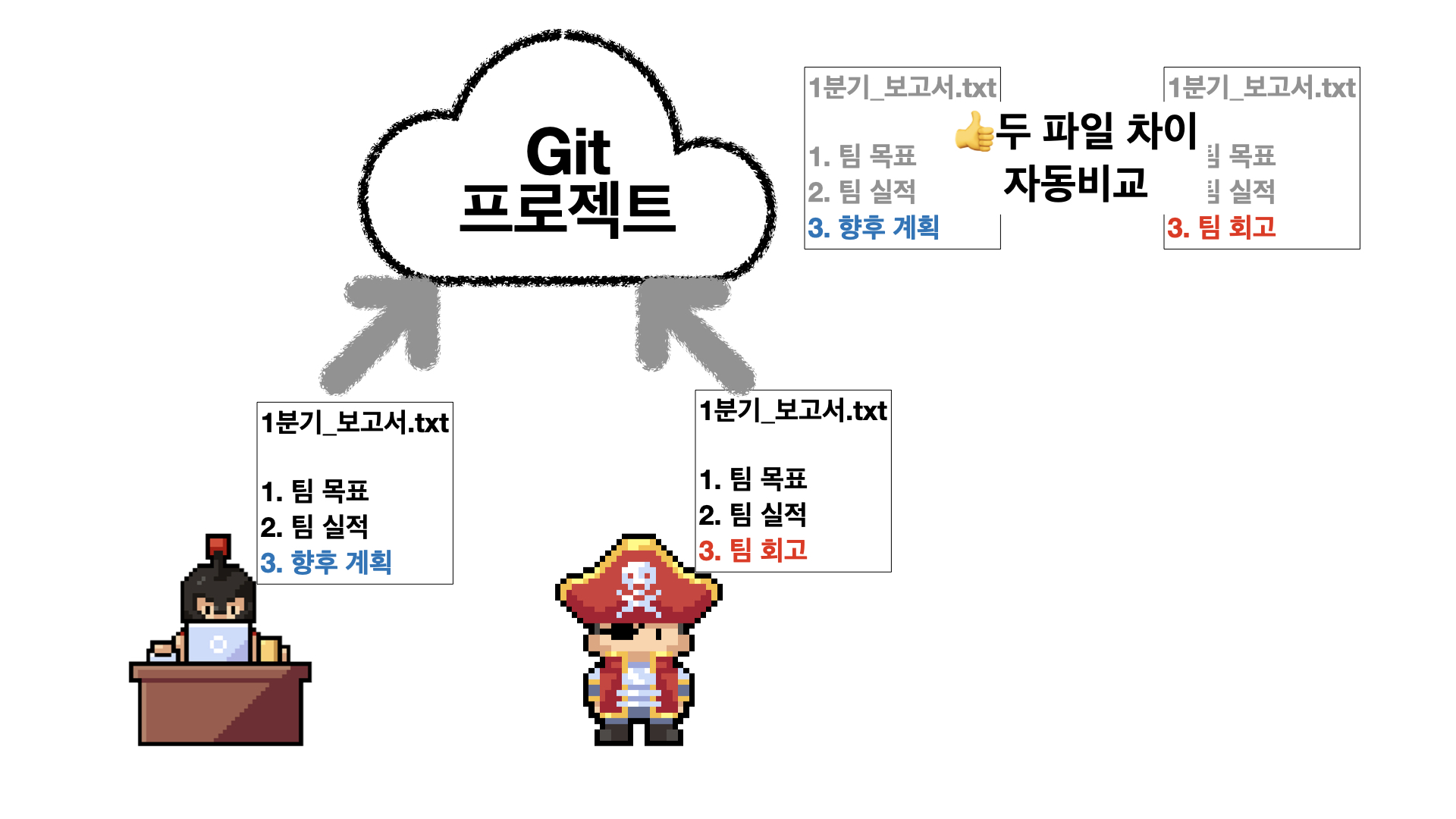 Git 을 사용하면 같은 파일명의 내용이 어떤 부분이 다른지를 자동으로 비교하고, 어떤 것을 반영할지 선택이 가능하다.