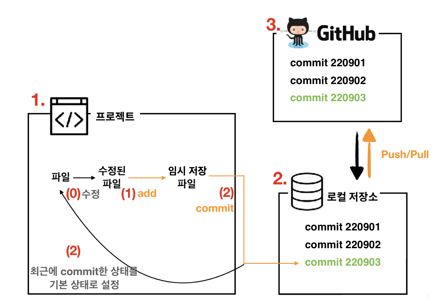 Commit(커밋) : 파일을 Git 저장소에 기록하는 것, 어떤 작업인지에 대한 메시지를 기록