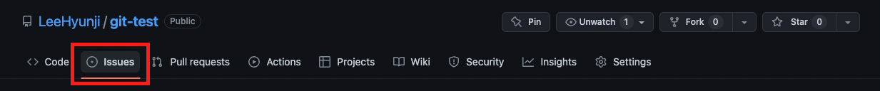 GitHub 페이지 원격 repo에 접속해서 issue 탭을 누르면 issue를 관리하는 페이지로 가게 된다.