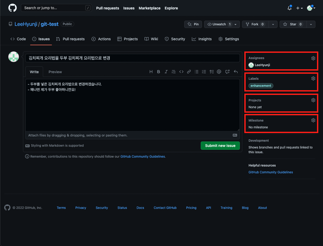 Submit new issue를 누르면 이슈가 생성이 된다. issue는 issue상세페이지에서 close와 reopen을 할수 있다.